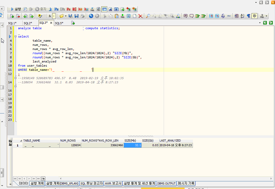 먼저 정확한 테이블 용량을 측정하기 위해 analyze문을 이용해 통계 정보를 작성합니다.